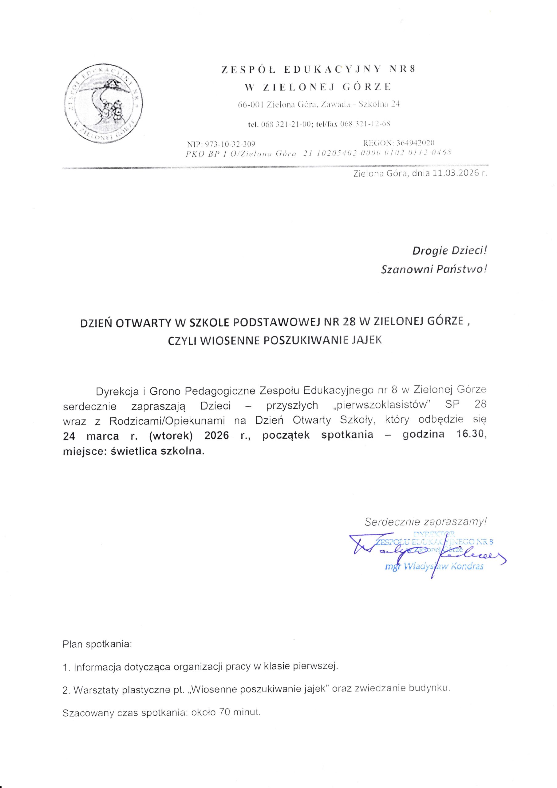 Dyrektor i Grono Pedagogiczne Zespołu Edukacyjnego nr 8 w Zielonej Górze serdecznie zapraszają Dzieci – przyszłych „pierwszoklasistów” SP 28 wraz z Rodzicami/Opiekunami na Dzień Otwarty Szkoły, który odbędzie się 24 marca r. (wtorek) 2026 r., początek spotkania – godzina 16.30, miejsce: świetlica szkolna.