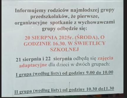 Szanowni Rodzice, zapraszamy wszystkich Rodziców najmłodszej grupy przedszkolaków na zebranie organizacyjne z wychowawcami grupy ( 20.08.2025 – środa; o godz 16.30) oraz na zajęcia adaptacyjne dla nowych dzieci (21 i 22.08. 2025) zgodnie z podziałem na grupy.