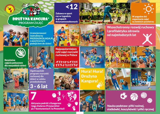 System PRZEDSZKOLIADA.PL składa się z szeregu autorskich projektów rozrywki ruchowej, na czele z czteroletnim programem zajęć Drużyny Kangura.