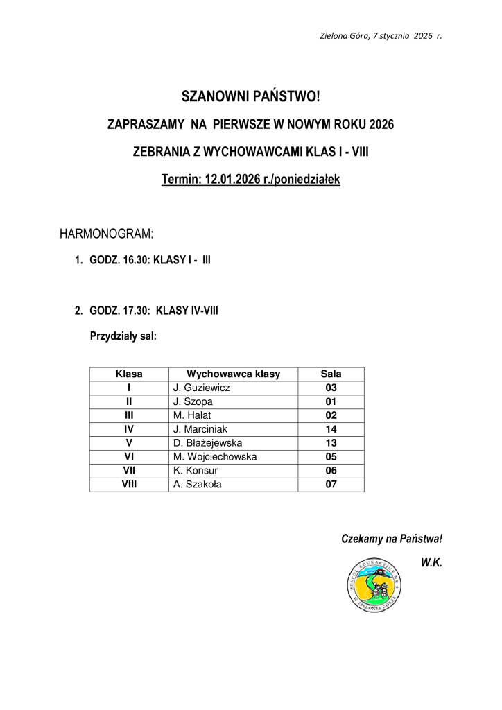 Aktualności / Imprezy szkolne / WydarzeniaSZANOWNI PAŃSTWO! ZAPRASZAMY NA PIERWSZE W NOWYM ROKU 2026 ZEBRANIA Z WYCHOWAWCAMI KLAS I – VIII – Termin: 12.01.2026 r./poniedziałek 2026-01-07